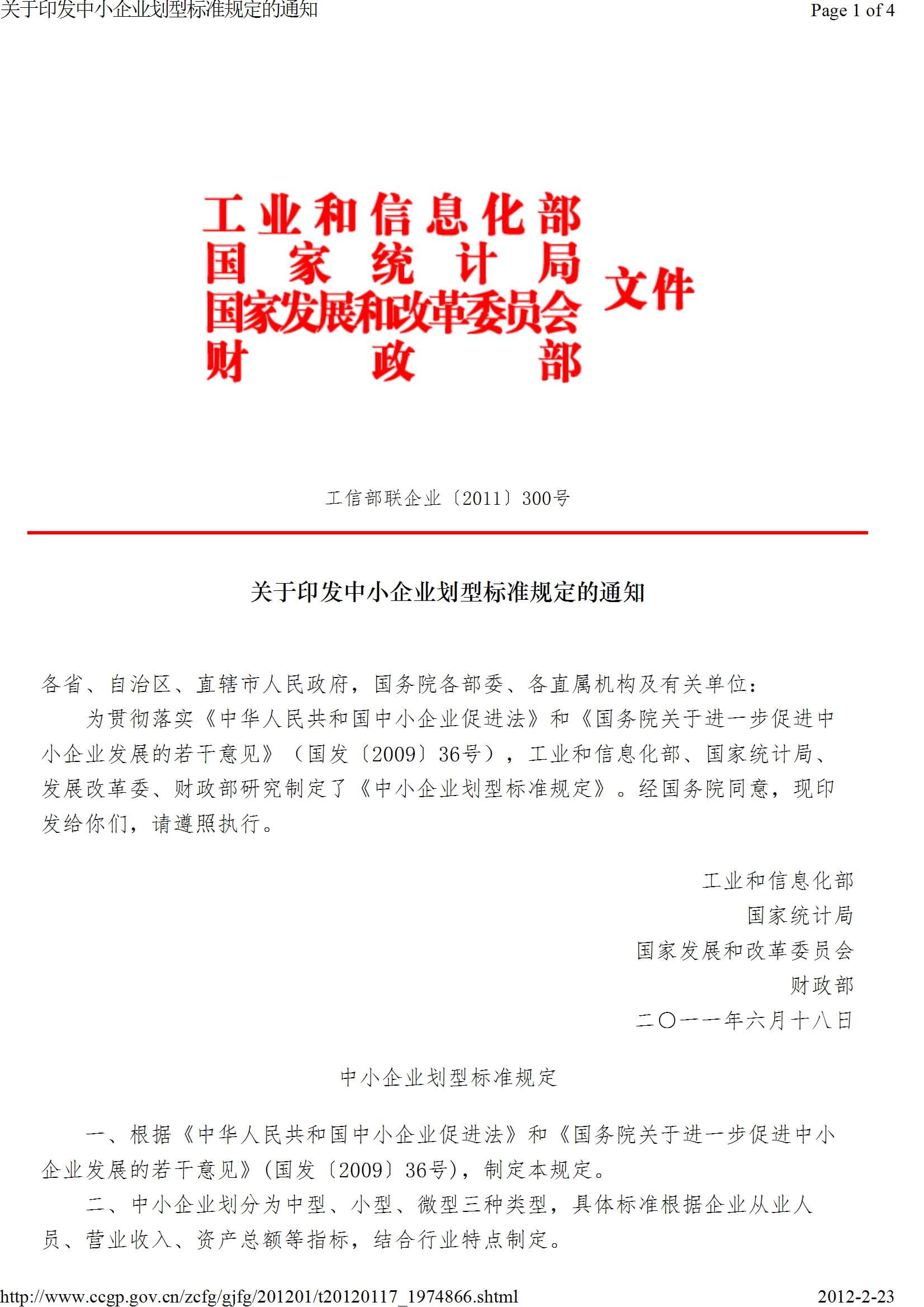 《关于印发中小企业划型标准规定的通知》工信部联企业[2011]300号