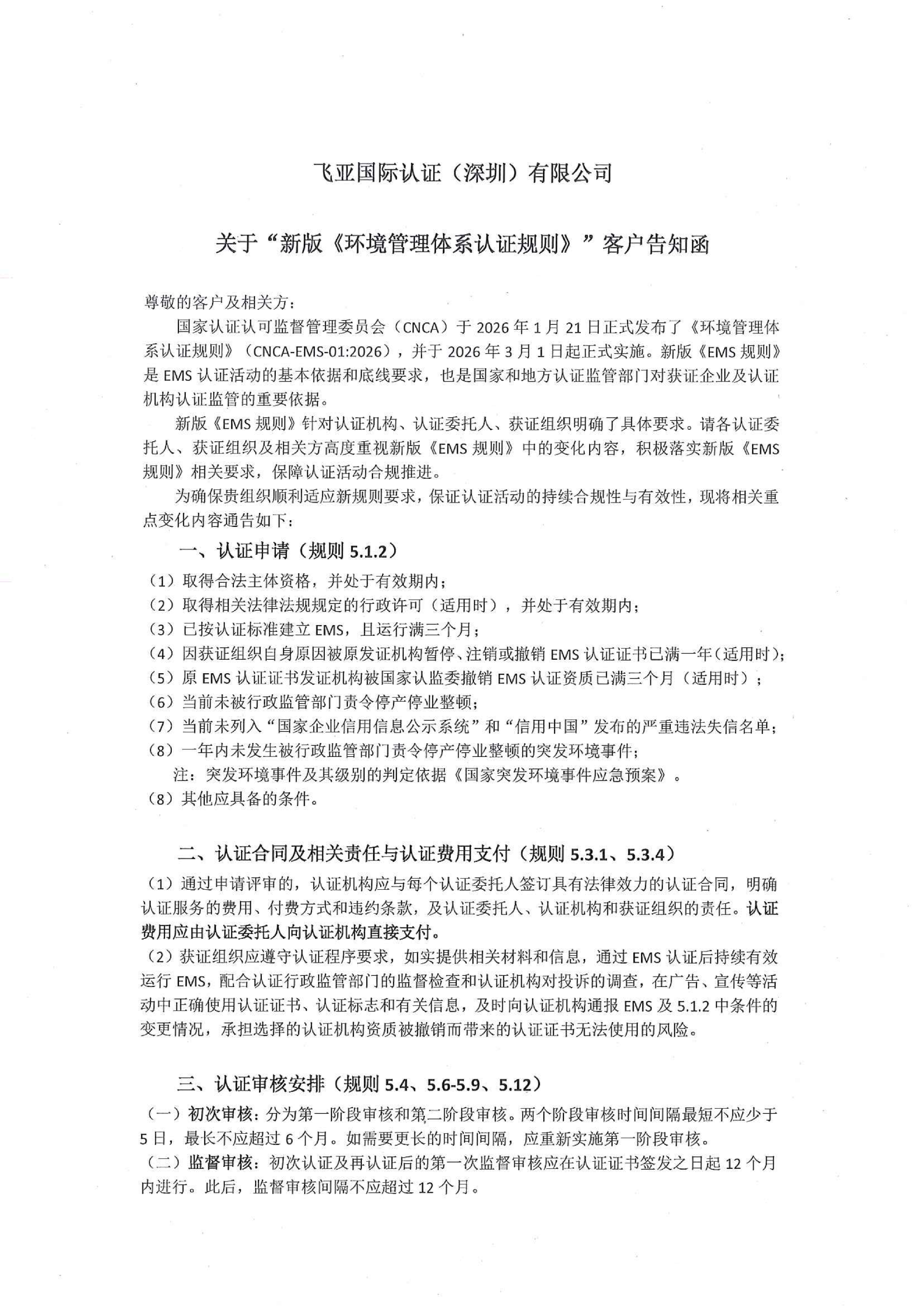 飞亚国际认证关于《新版环境管理体系规则》客户告知函