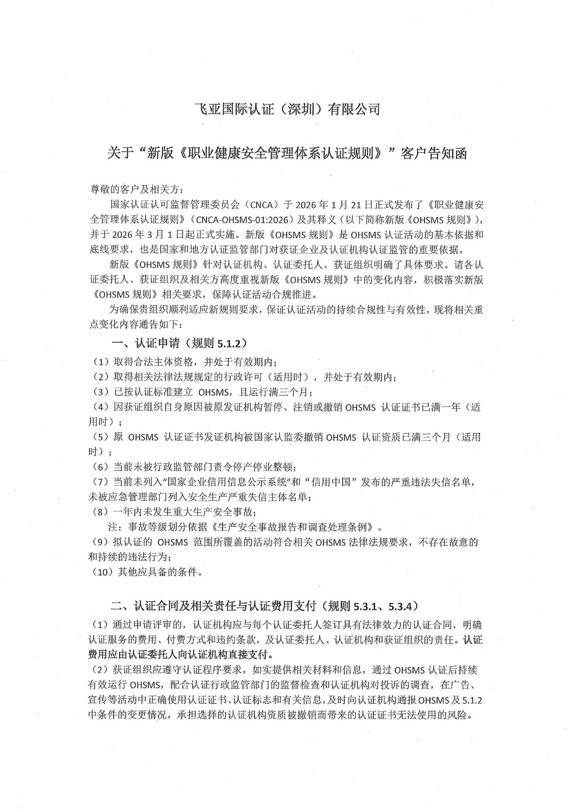 飞亚国际认证关于《新版职业健康安全管理体系规则》客户告知函
